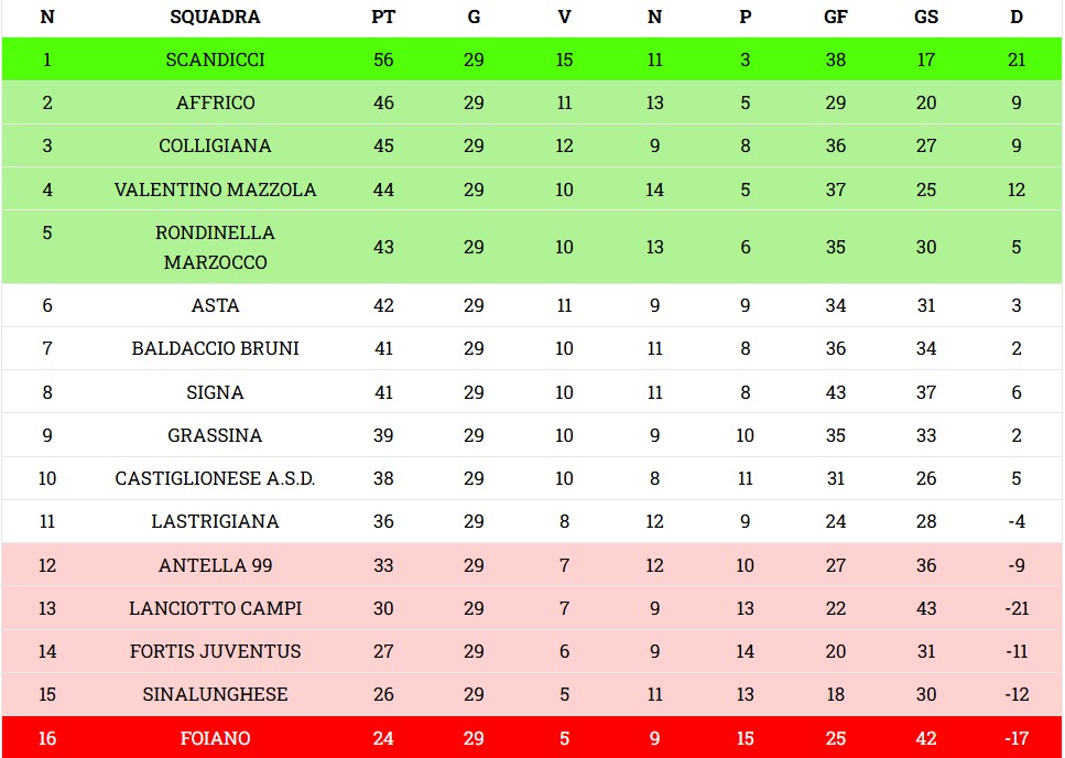 Deve vincere per forza e sperare che si verifichi almeno uno degli esiti Rondinella-Signa X2 e Valentino Mazzola-Grassina 2. E’ in svantaggio nella classifica avulsa in caso di arrivo a 45 alla pari con Colligiana e Valentino Mazzola. Se pareggia è fuori, raggiunge quota 43 e rimane dietro al Signa se vince con la Rondinella, o dietro la Rondinella se non perde con il Signa.