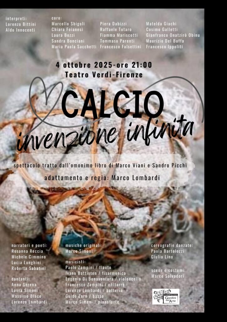 Sabato 4 ottobre al Teatro Verdi di Firenze alle ore 21 la Compagnia “I Giardini dell’Arte”, con la regia di Marco Lombardi, metterà in scena la trasposizione teatrale del libro “Calcio Invenzione Infinita” di Sandro Picchi e Marco Viani – nella foto di copertina con Luciano Spalletti -, pubblicato da Firenze con Te ODV nel dicembre 2023.