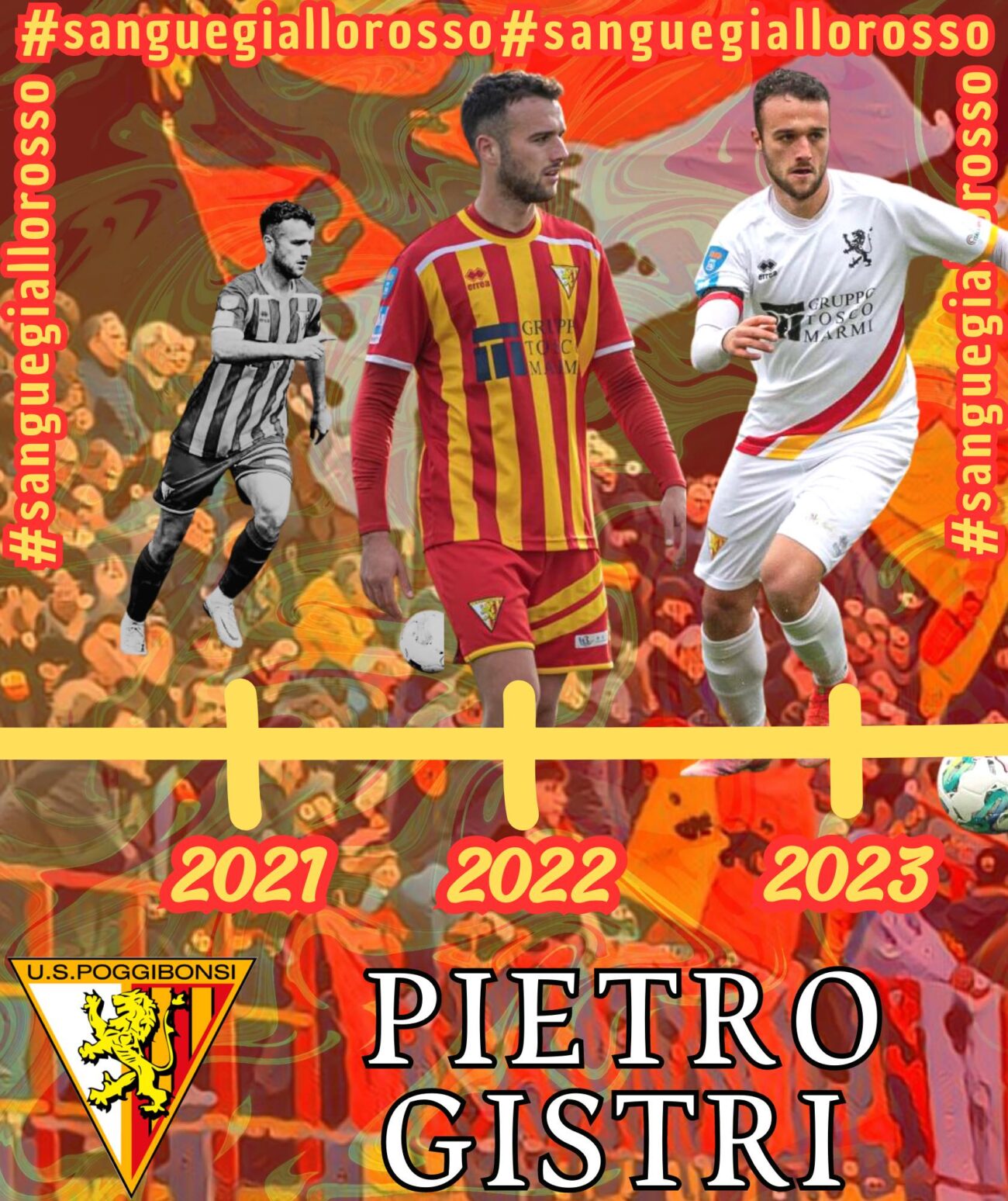 Il Poggibonsi annuncia di aver rinnovato il contratto al centrocampista Pietro Gistri: il professore confermato in giallorosso per la stagione 2023/24, uomo d’ordine, di disciplina, ma anche d’irruenza in campo. Pietro veste la maglia del Poggibonsi dalla stagione 2021 e ha collezionato con i colori giallorossi fino ad oggi 61 presenze mettendo a segno 6 gol. Un percorso quello della stagione 2022/23 che ha visto Pietro impegnato varie volte in varie zone del campo sempre dimostrando personalità come un veterano in qualsiasi occasione. La società augura buon lavoro e buon campionato a Pietro.