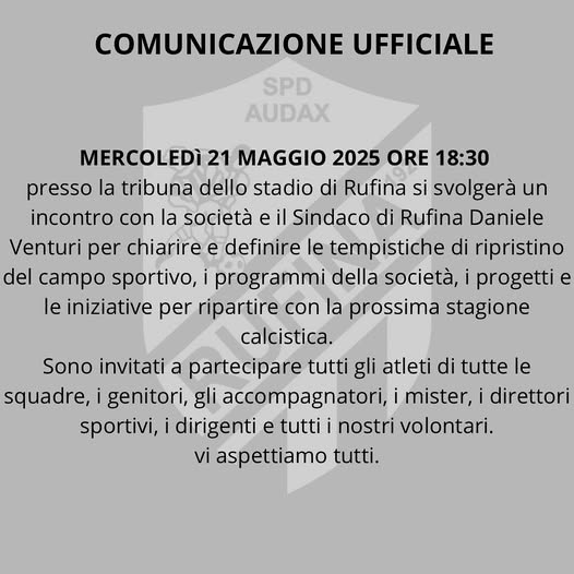 Riportiamo la comunicazione dell’incontro fra società Audax Rufina e il Sindaco Daniele Venturi, aperto a tutti gli atleti e agli appassionati. Nel frattempo in arrivo Alex Ceramelli dal Bibbiena, come riporta la pagina Facebook Dilettanti Arezzo.